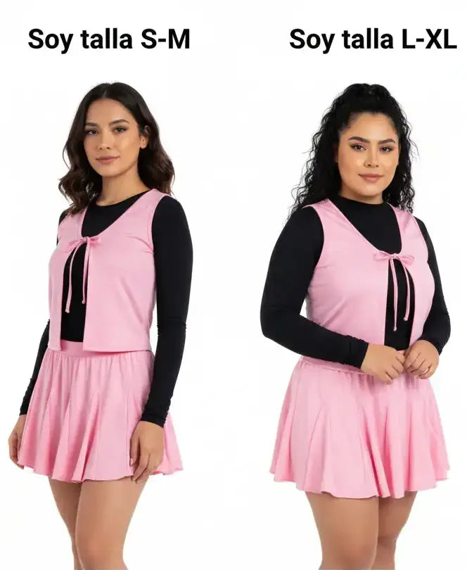 Diseño: Chaleco corto tipo bolero, tirantes anchos y lazo decorativo frontal, sin cierres.