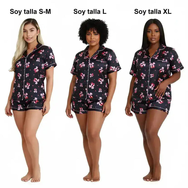 Esta pijama de satín es súper fresca, ideal para las noches de calor. El estampado de lazos y corazones es muy coqueto, y el ribete rosa le da un toque clásico. Me siento cómoda y con estilo incluso para estar en casa.