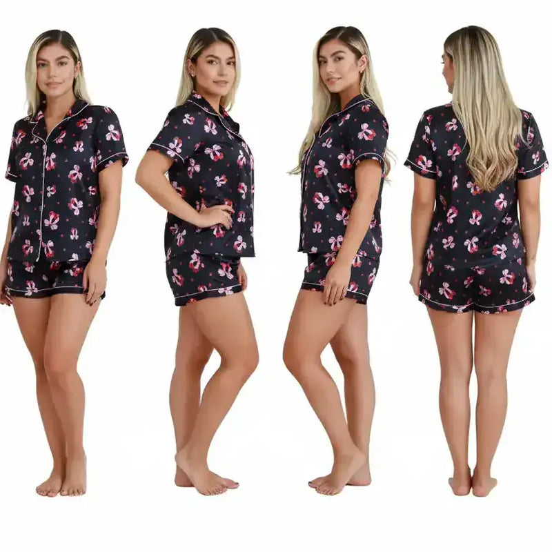 Diseño: Conjunto de pijama de dos piezas con blusa tipo camisera de manga corta y botones frontales + short fluido con cintura elástica para mayor comodidad.