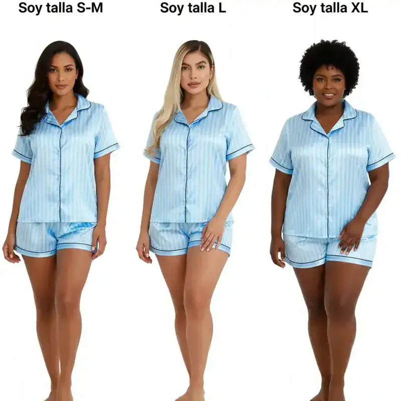 Esta pijama de satín a rayas azules y blancas es exactamente lo que necesitaba para el calor de Cali. Es muy ligera y la tela es súper fresca, se siente muy agradable sobre la piel. El estilo de camisa con el short es clásico, pero el ribete negro le da un toque moderno y pulido. El corte es holgado, lo que permite moverse sin restricciones durante la noche. Es cómoda, práctica y muy bonita. ¡Una excelente inversión para descansar!