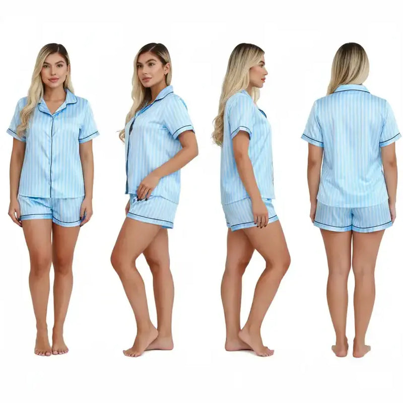 Diseño: Conjunto de pijama de dos piezas con blusa tipo camisera de manga corta y botones frontales + short fluido con cintura elástica para mayor comodidad.