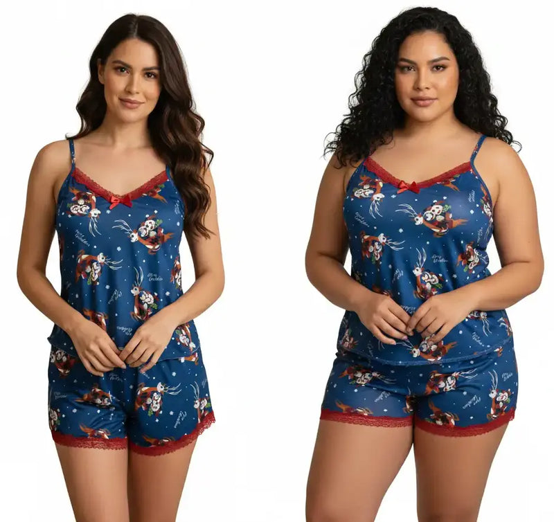 Diseño: Conjunto de pijama femenino de dos piezas con tiras delgadas, escote en V, detalles en encaje y short holgado para máximo confort.