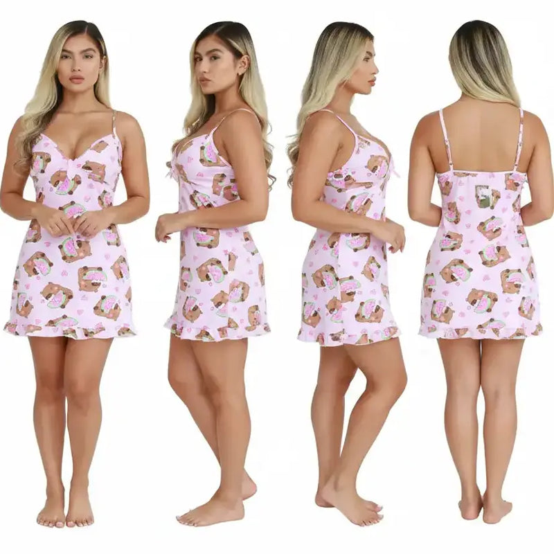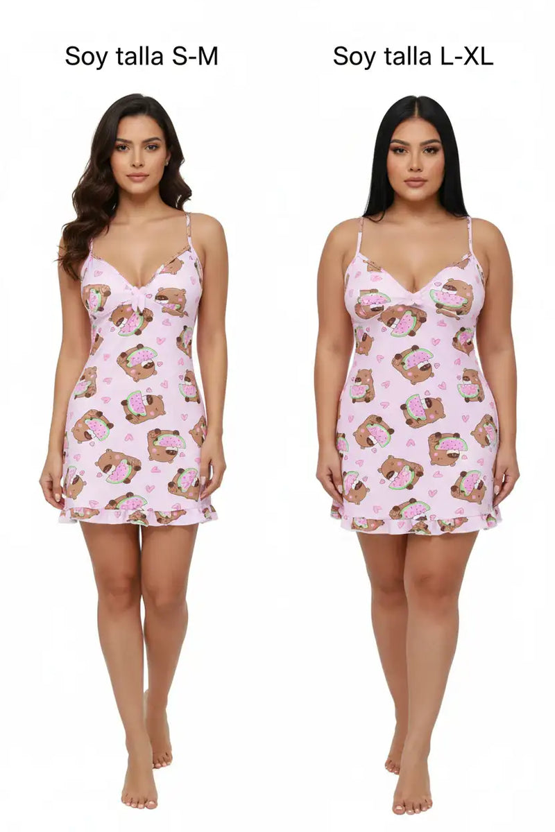 Diseño: Batita corta con escote en V, tirantes Delgados y holanes; un look coqueto y cómodo para interiores.