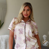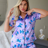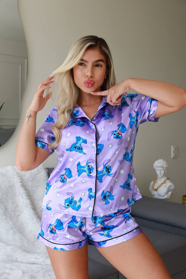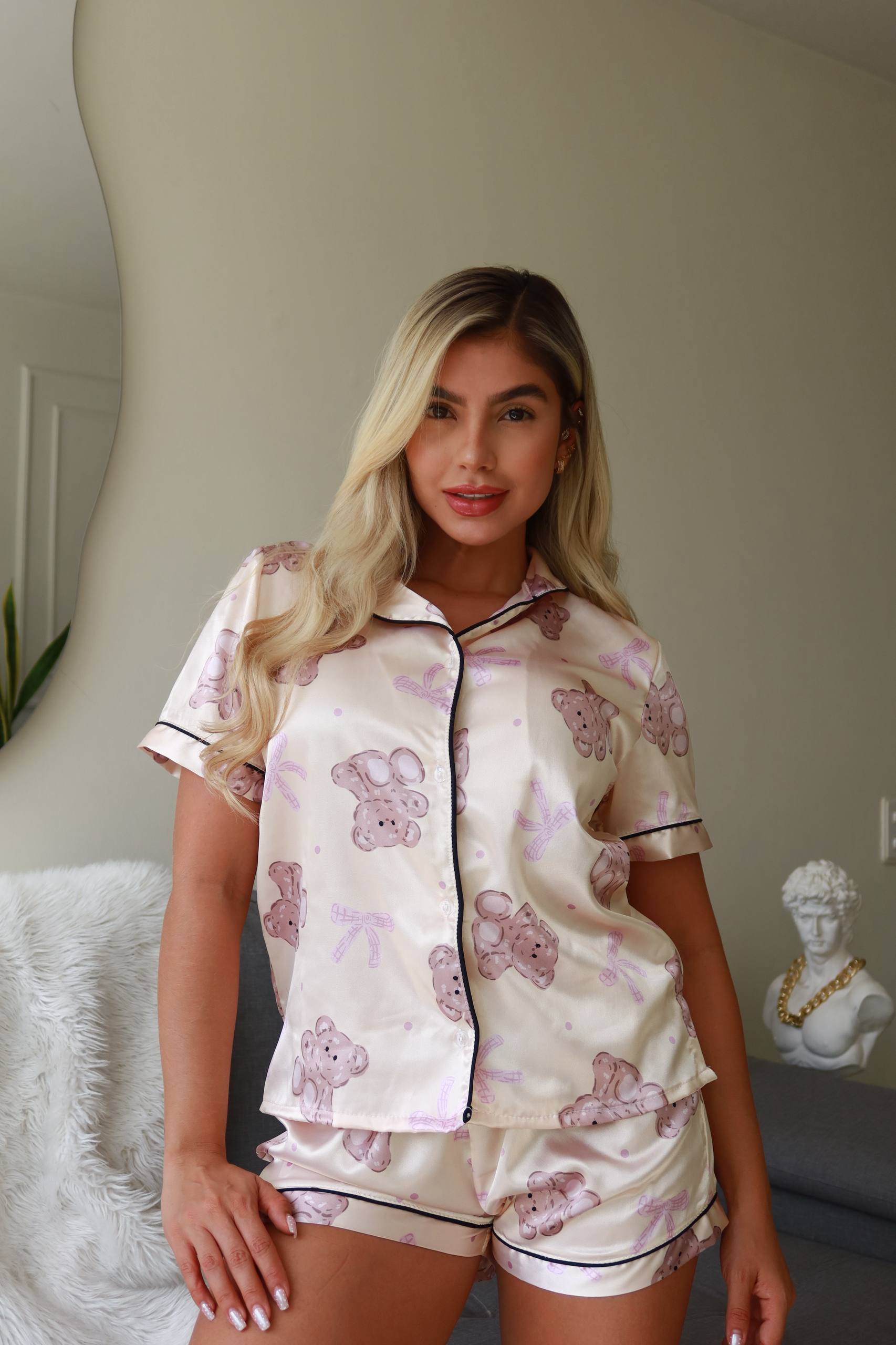 Diseño: Conjunto de pijama de dos piezas con blusa tipo camisera de manga corta y botones frontales + short fluido con cintura elástica para mayor comodidad.