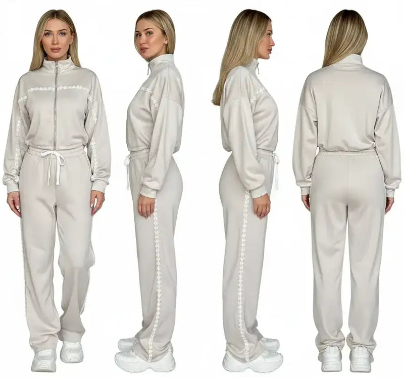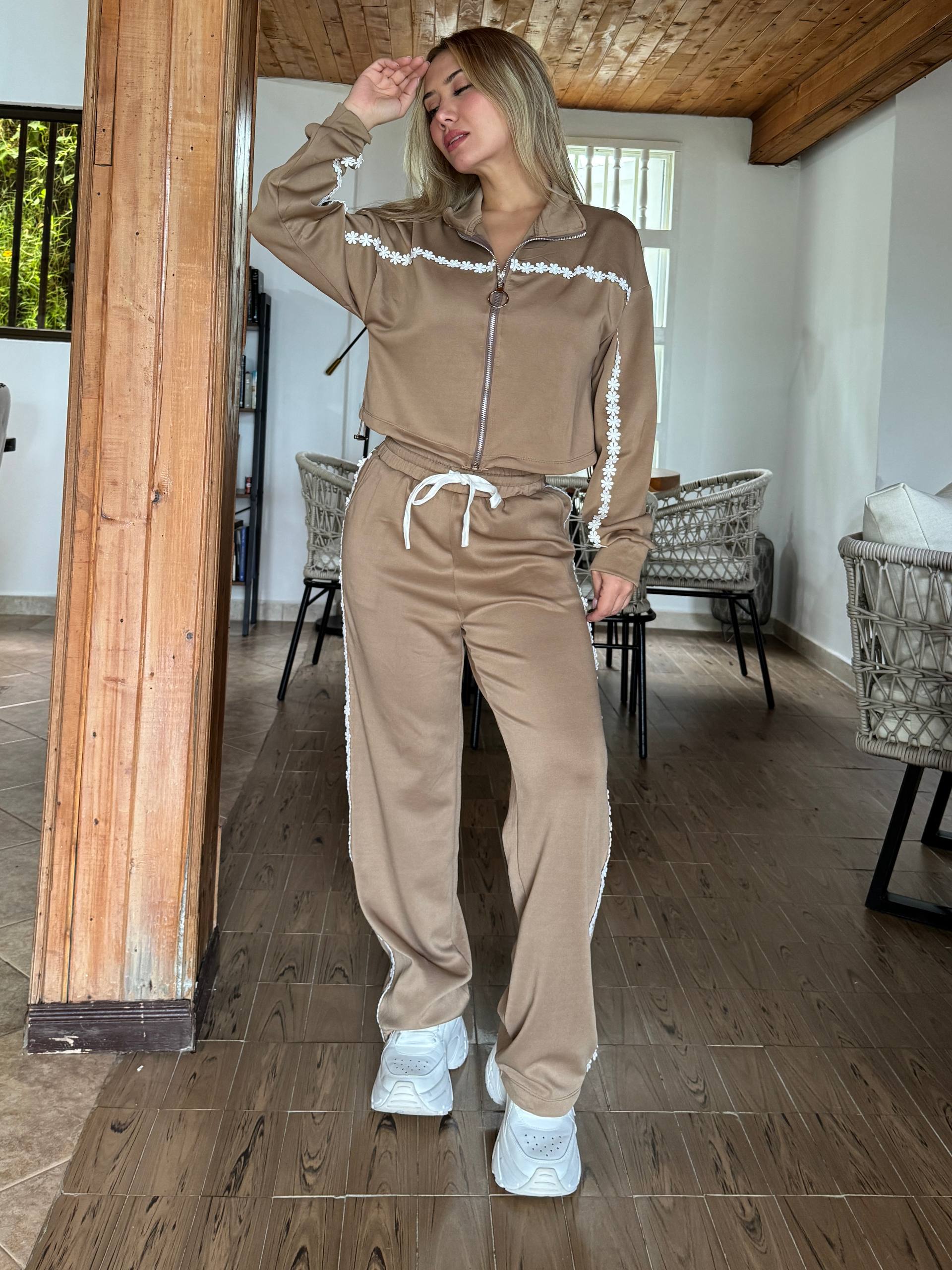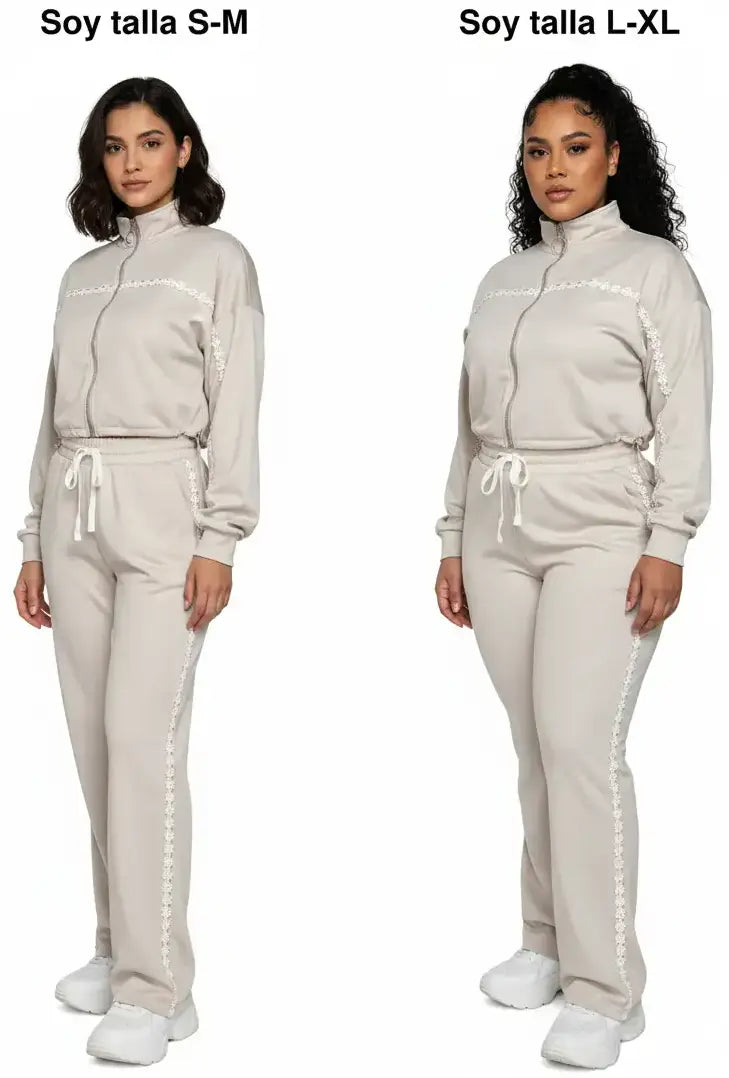 Diseño: Conjunto de dos piezas estilo urbano-deportivo, compuesto por chaqueta cropped con cierre frontal y jogger de cintura ajustable con detalles lineales decorativos.
