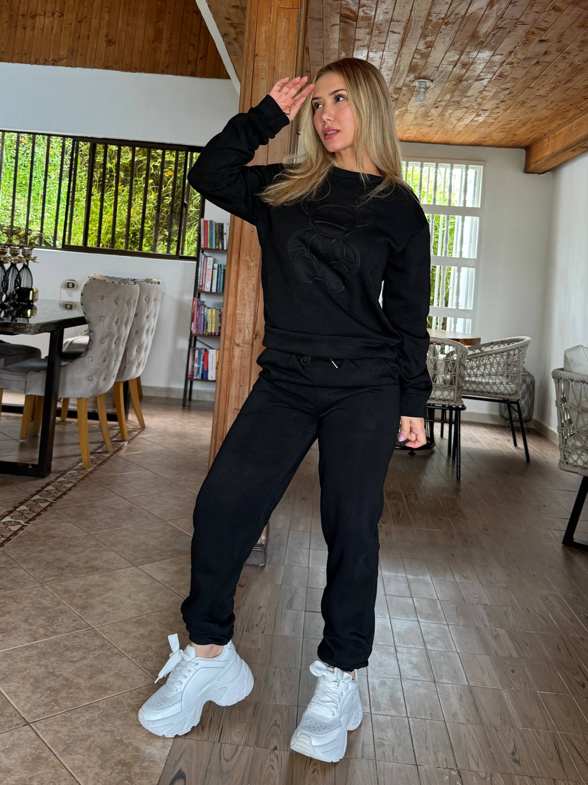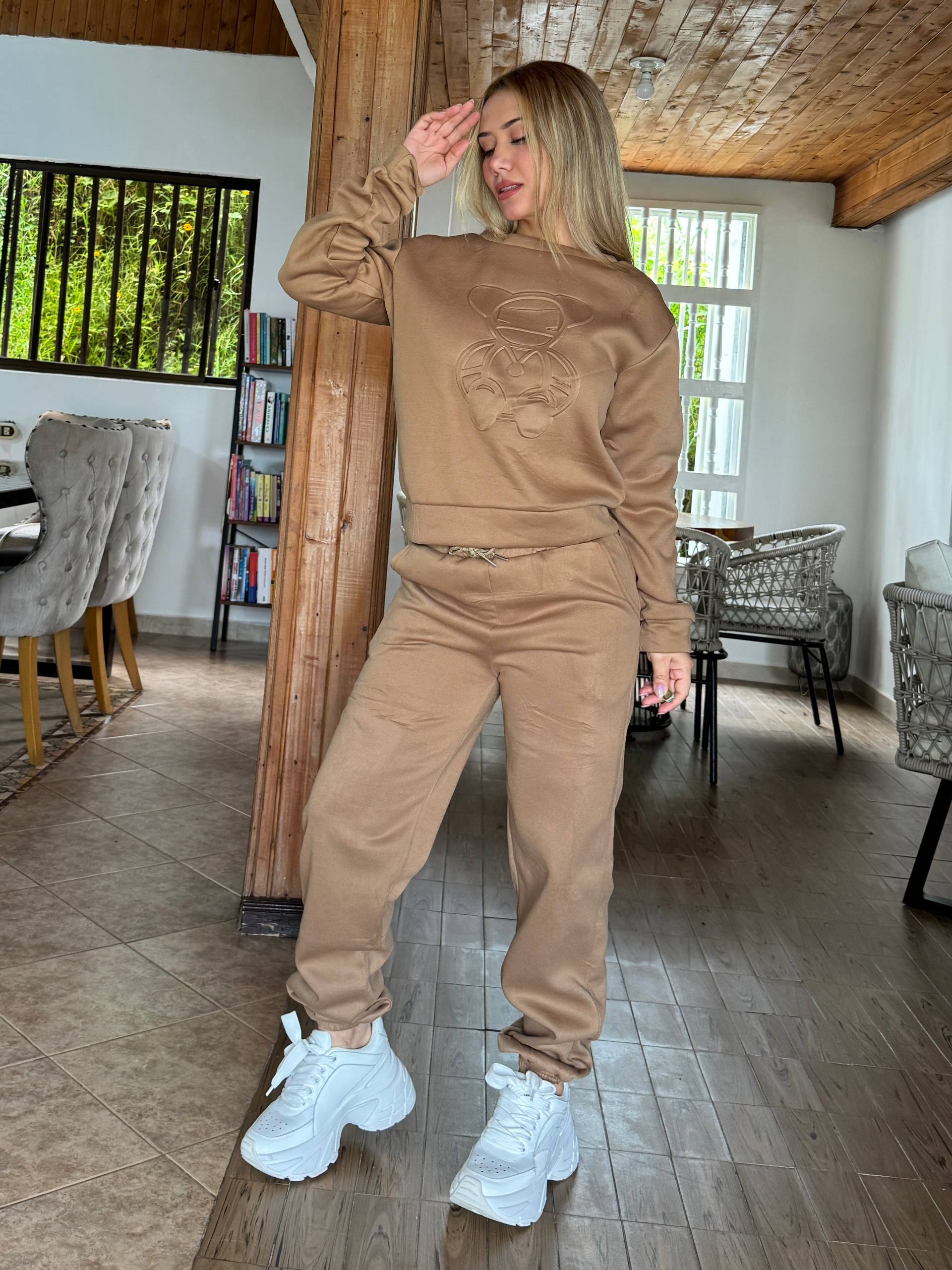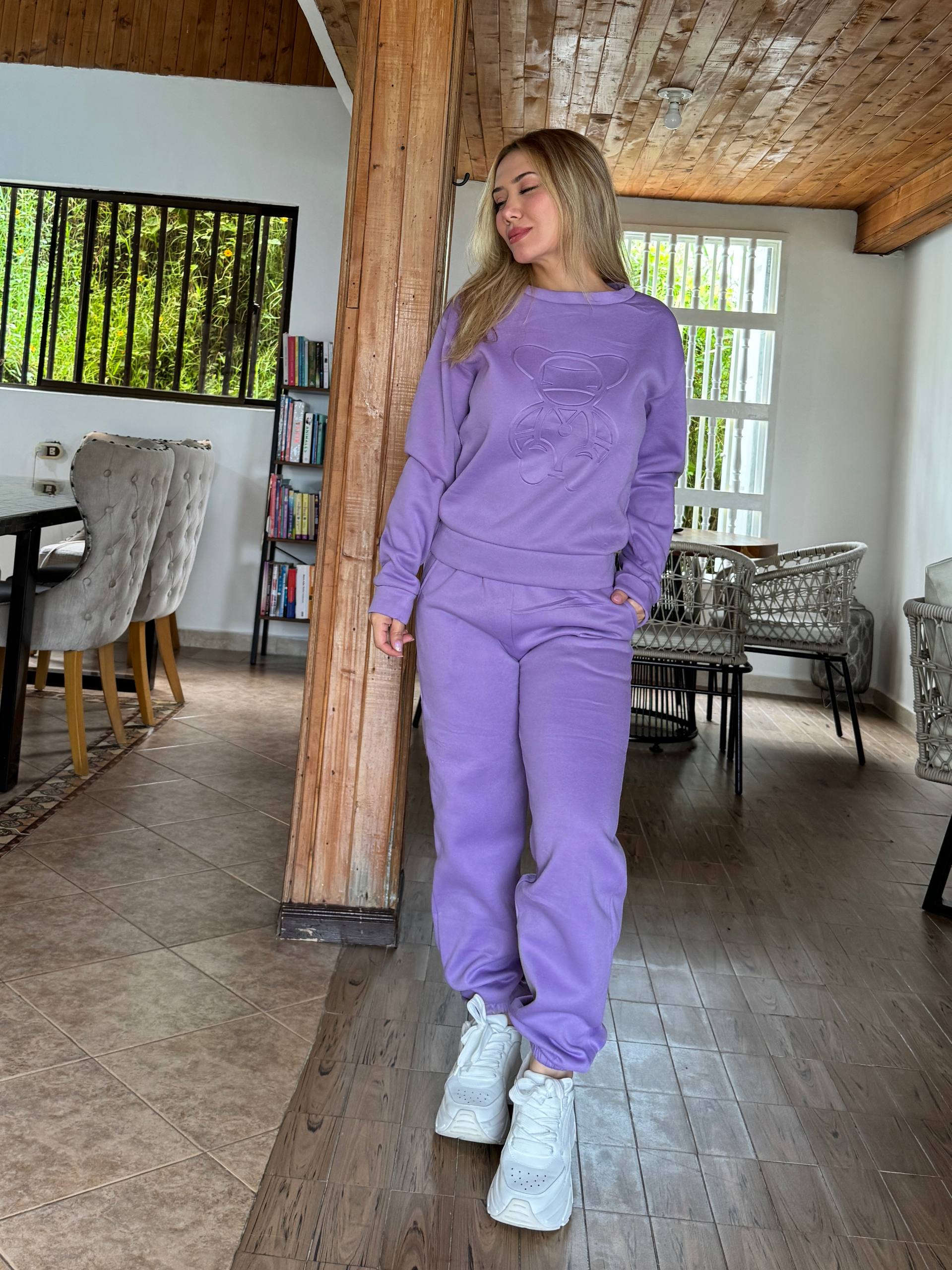 Es un conjunto comodísimo, ideal para estar en casa o salir casual. El material es calientico y de buena calidad, no se estira ni se deforma al lavar. ¡Totalmente recomendado